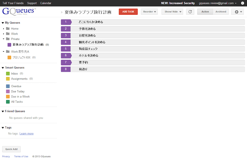たとえば仕事でチームメンバがGQueuesを使っていれば、「あいつは今こんなタスク抱えてるんだな」という確認が出来ます。