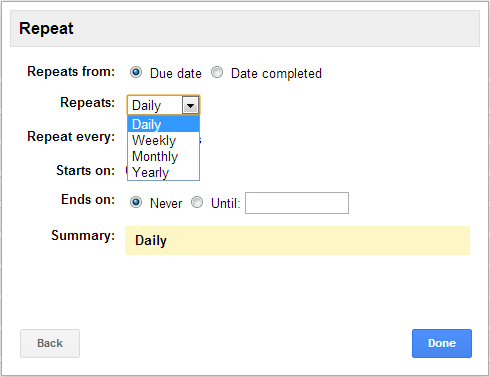リピートの指定は、日次/週次/月次/年次をベースに柔軟な指定が可能です。